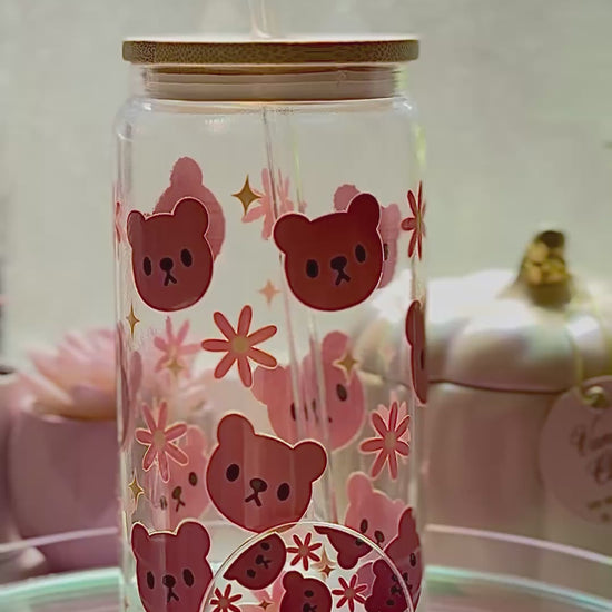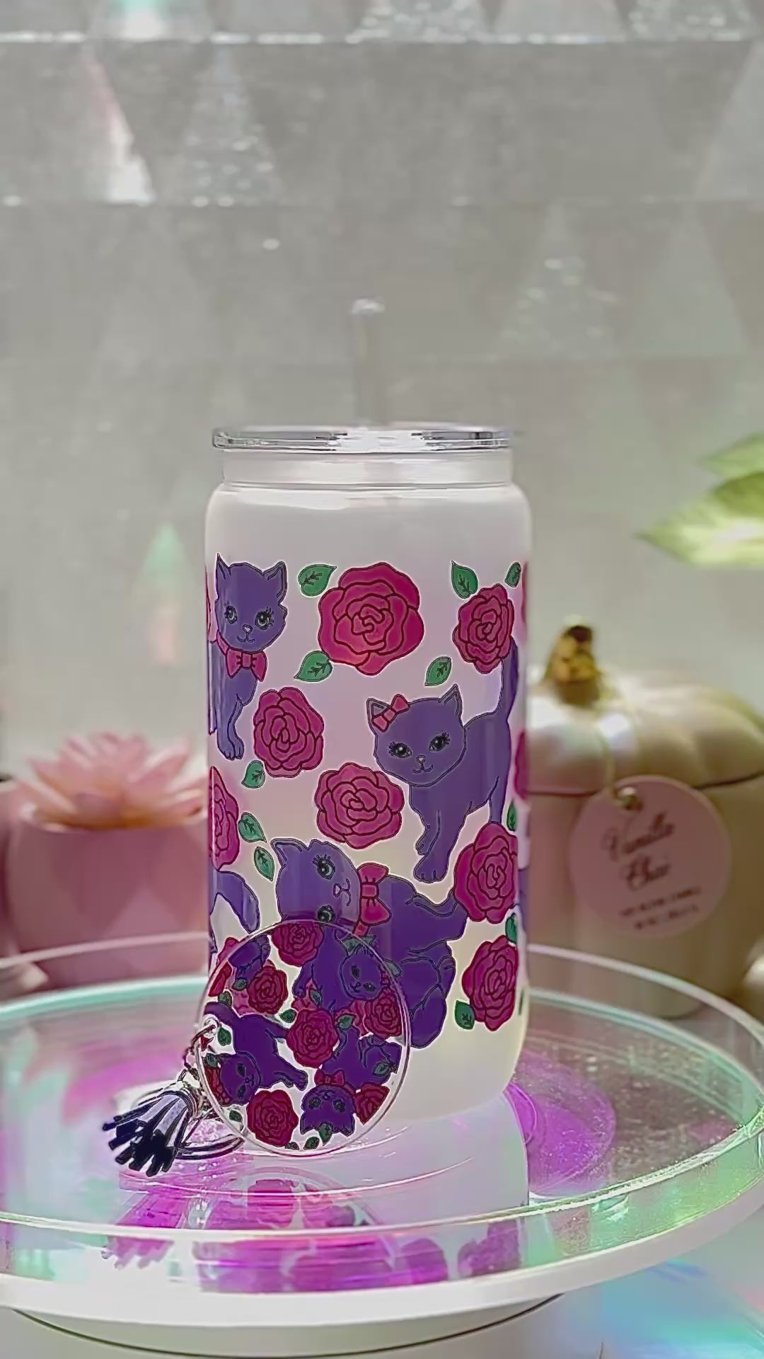 Each bundle includes a 16oz glass cup with matching acrylic keychain. This set adds a cozy, aesthetic touch to your everyday routine. Whether you're reading a book, running errands, or gifting, this matching set is perfect. It combines cuteness and practicality.